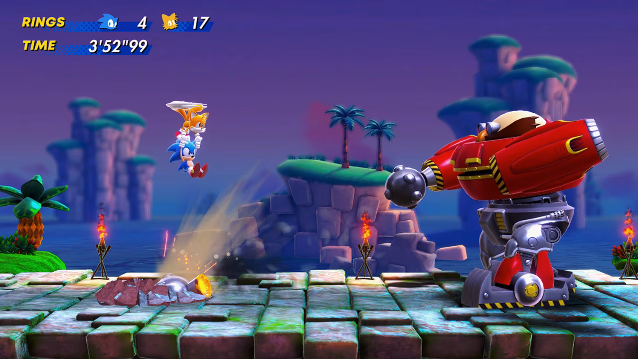 R: É verdade que Tails pode voar para chegar a alguns lugares onde é difícil pular, mas o jogo ainda é projetado para que Sonic possa jogar sozinho e completar os níveis normalmente. Para permitir que todos os quatro personagens joguem, foram projetados níveis exclusivos. Espero que todos possam tentar o seu melhor para usar as habilidades dos quatro personagens.